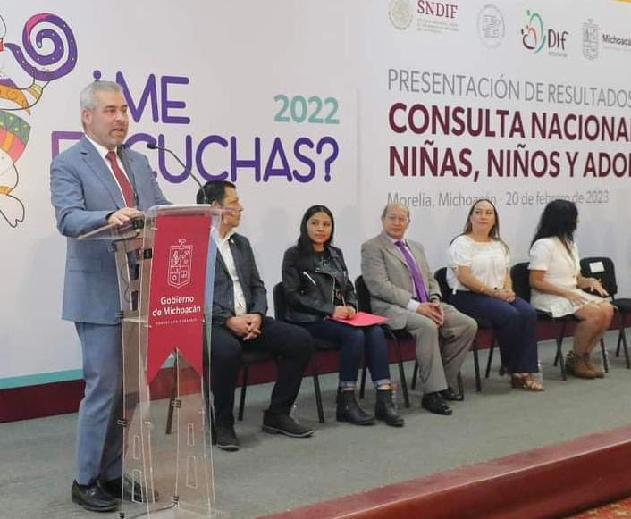 Morelia, Michoacan, 20 de febrero de 2023.- En el marco de la presentación de resultados de la Consulta Nacional a Niñas, Niños y Adolescentes “¿Me Escuchas? 2022”, el gobernador Alfredo Ramírez Bedolla, manifestó que es trabajo de las autoridades y funcionarios brindar apoyo, respuesta y acompañamiento a las necesidades de la población infantil.