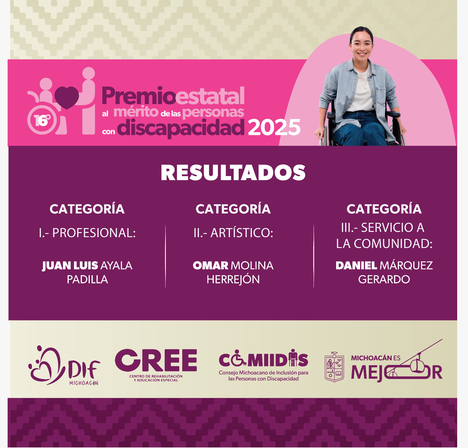 El @Gobierno de Michoacán, a través del Sistema #DIFMichoacán y el Consejo Michoacano para la Inclusión de las Personas con Discapacidad, dan a conocer los resultados de la convocatoria, 16 Premio Estatal al Mérito de las Personas con Discapacidad 2025.